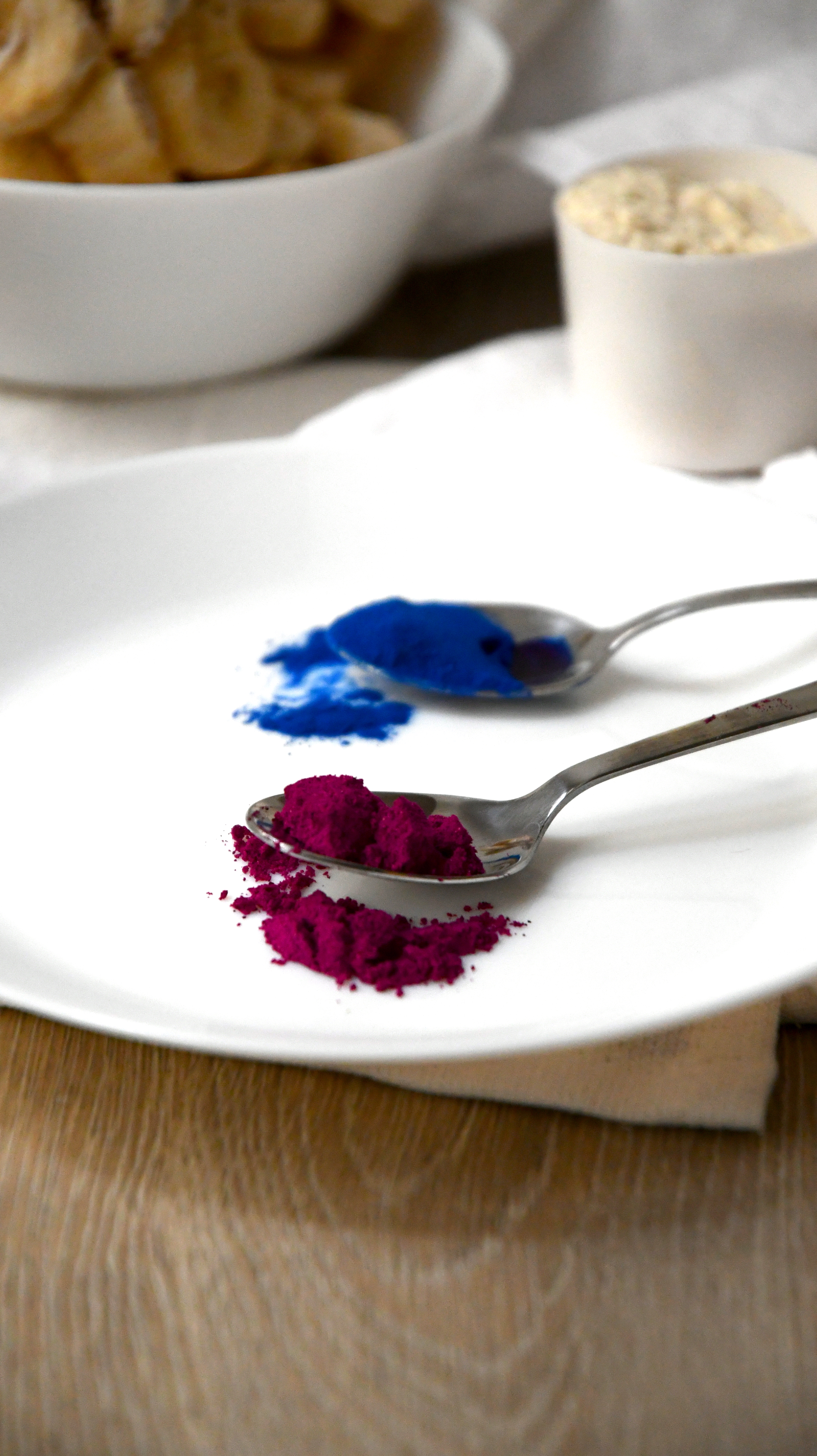 Now its time to add the color. Put a teaspoon of pink pitaya powder into the first bowl and mix it well until you get a beautiful pink color.