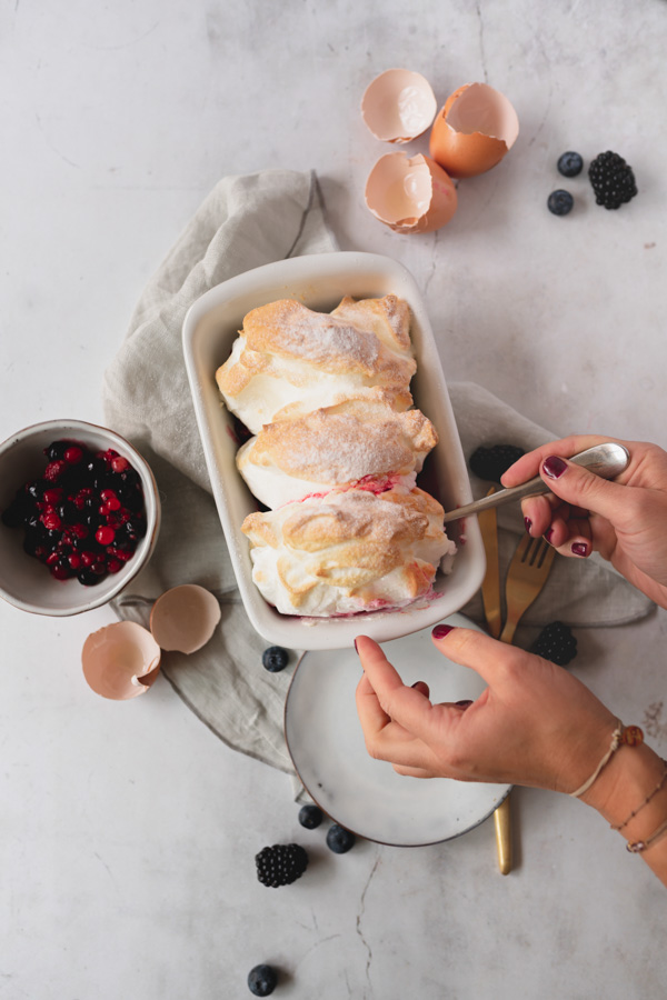 Mit zwei großen Löffeln den Eischnee nockerlartig auf die Beeren setzen.