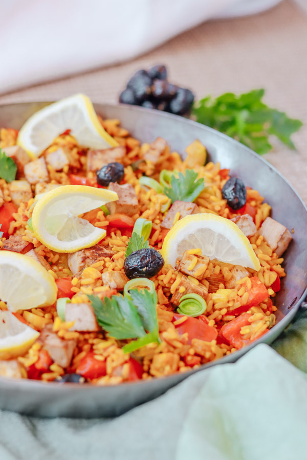- Tofu und die Oliven unter die Paella mischen. Mit Salz und Pfeffer nach Geschmack würzen. Eventuell noch mit Kurkuma oder Paprikapulver nachwürzen. Mit Zitrone und Petersilie garnieren. Die Paella 5 weitere Minuten ziehen lassen, bis sich die Aromen entfalten.