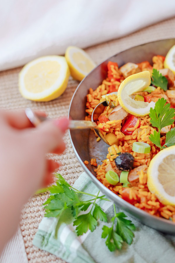 Du wirst diese Rezept lieben, denn die Paella ist sehr einfach zuzubereiten, denn du benötigst nur wenige Zutaten und eine große Pfanne. Somit ist sie ein schnelles One Pot Gericht. Weiters kannst du die Zutaten je nach Lust und Laune anpassen. Wenn du beispielsweise gerne Garnelen oder sonstige Meeresfrüchte in deiner Paella isst, dann kannst du diese nach Belieben hinzufügen. Das spanische Reisgericht eignet sich außerdem perfekt um mit Freunden zu teilen oder Portionen für die nächsten Tage zuzubereiten.