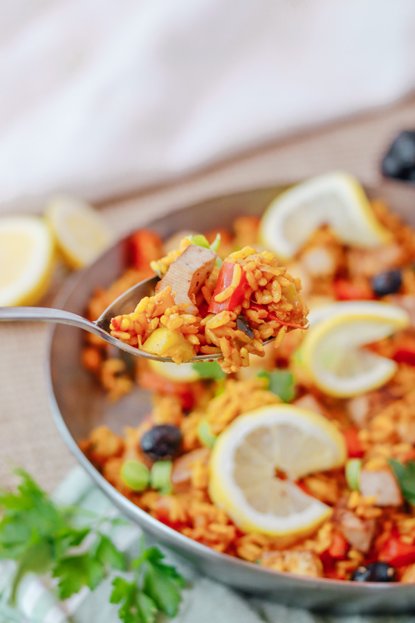 In dieser Paella findest du sehr viel Gemüse, was dazu führt, dass die Paella kalorienärmer ist. Eine Portion hat rund 370 kcal aber macht tatsächlich richtig satt. Der knusprige Tofu ist mein Favorit in diesem Gericht denn er bringt einen tollen Geschmack mit hinein. Ich habe Naturtofu verwendet aber ich bin mir sicher, dass auch Räuchertofu gut in die Paella passen würde. Der Tofu ist perfekt um auch etwas Protein in die Speise zu bringen. Es kann natürlich auch Tempeh oder eine andere Proteinquelle wie beispielsweise Käferbohnen verwendet werden. Die Oliven, sowie das Olivenöl liefern uns die gesunden Fette und der Reis unsere Kohlenhydrate. Ich persönlich finde eine Kombination aus allen Makronährstoffen super, da ich dadurch sehr lange gesättigt bin.