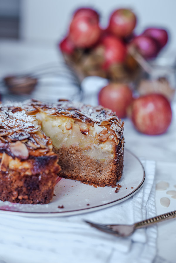 Ich glaube man sieht auf dem Foto hier oben wie wunderschöne saftig dieser Apfelkuchen mit Pudding ist. Der Teig ist fluffig und weich. Die verschiedenen Schichten – Mandelblättchen – Pudding – Apfel und Teig machen jedes Stück Kuchen zu einem Gaumenschmaus.