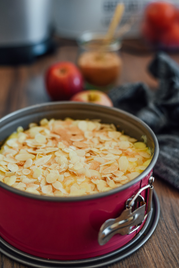 Man braucht auch kein sonderliches Equipment für diesen einfachen Apfelkuchen mit Pudding. Ich habe zum Beispiel den Teig einfach mit der Hand geknetet und hatte nicht mal ein Rührgerät. Am besten machst du diesen Apfelkuchen in einer Springform. Du kannst zur Not auf eine Silikonform benutzen, allerdings muss man danach den Kuchen stürzen und es könnten somit einige der Mandelblätter abfallen. Falls du keine Springform hast mache vielleicht lieber einen Blechkuchen daraus oder Muffins!