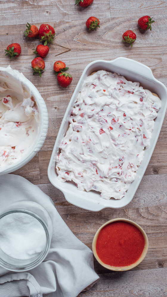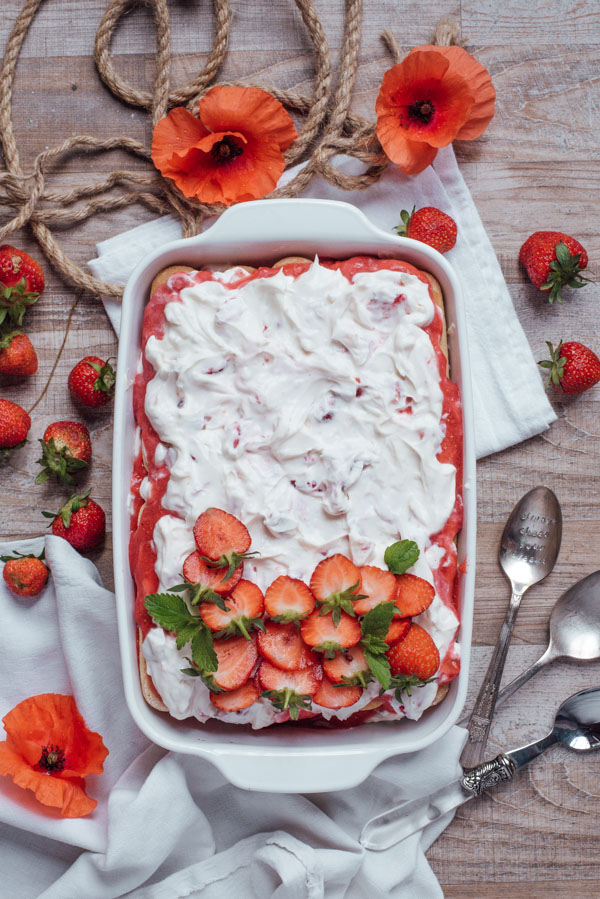Ihr werdet sehen wie wundervoll einfach dieses Erdbeer-Dessert ist. Innerhalb von 15 Minuten ist es auch schon fertig. Es muss allerdings für ein paar Stunden kalt gestellt werden, damit der Löffelbiskuit schön weich wird.