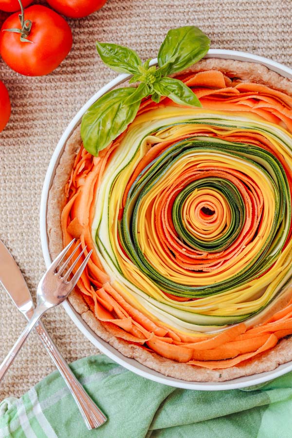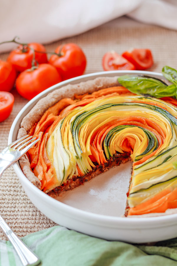 Die Zubereitung sieht vielleicht auf den ersten Blick etwas kompliziert aus. Doch tatsächlich ist es sehr einfach. Der Teig ist in wenigen Minuten fertig und auch das anordnen der Spirale ist nicht sonderlich schwierig. Am Besten schmeckt die Tarte, wenn das Gemüse der Spirale ganz dünn geschnitten wurde. Vielleicht denkst du dir jetzt, dass die vegane Quiche langweilig schmeckt. Ich verspreche dir, dass du überzeugt sein wirst. Das mediterrane Pesto aus Tomaten, Basilikum und Olivenöl bringt einen wundervollen Geschmack hinein.