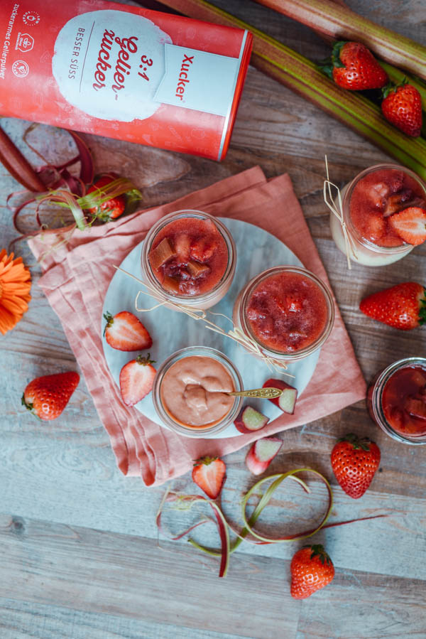- Rhabarber in diamantenförmige Stücke schneiden und in eine Schüssel geben. Mit Zitronensaft, Wasser und Xylit vermischen. Ziehen lassen.