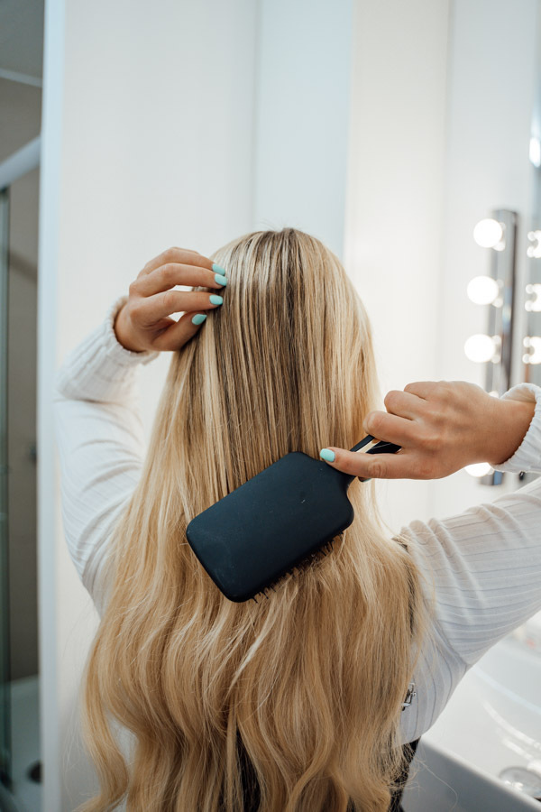 Der zweite wichtige Punkt beim Umgang mit einer Haarverlängerung, sei es jetzt Bondings oder Tape-ins, ist das Frisieren.