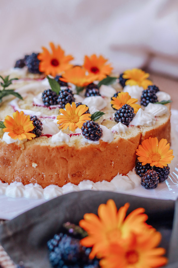 Biskuitteig mal anders! Biskuitroulade kennt man typischerweise gefüllt mit Marillenmarmelade oder einer leckeren Creme. Ich finde dies sieht oft langweilig aus, oder nicht? Wieso nicht einfach den Teig in Streifen schneiden und eine Spirale formen? Meine Wickeltorte aus Biskuitteig ist ein absoluter Hingucker und eignet sich perfekt für heiße Sommertage. Du kennst das bestimmt, dass du an heißen Tagen oft auf keine schweren Speisen Lust hast. Der Biskuitteig und die Creme sind leicht bekömmlich und die Brombeeren sorgen für das fruchtige Geschmackserlebnis.