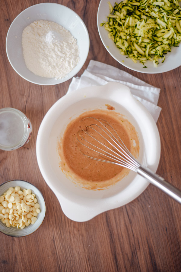 Zucchini mit einem Gemüseschäler in Streifen schälen und zwei bis drei Streifen nebeneinander hinlegen.